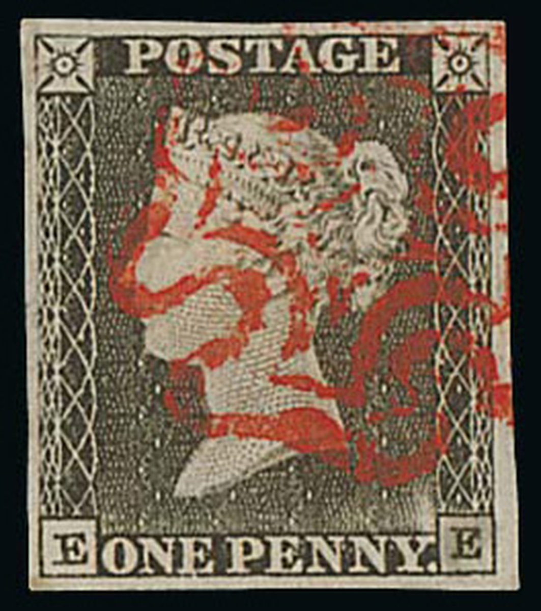 EE (extended serif to lower-left E),, grey-black shade, very worn Plate, good to large balanced margins,  red Maltese Cross cancellation; very fine and attractive