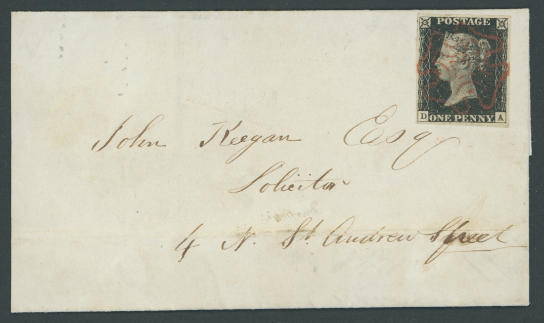 DA, good margins all round, cancelled by delicately struck Maltese Cross in brighter red shade, affixed to 1840 (June) entire letter locally addressed within London.  Horizontal filing fold at foot though most attractive.