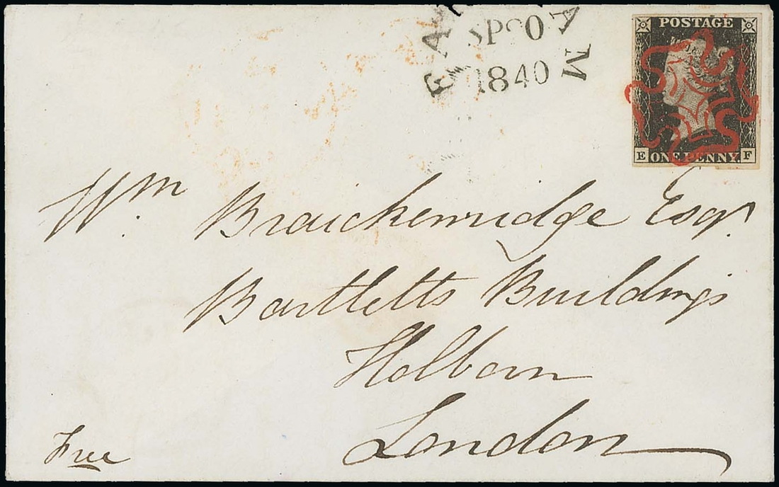 EF, good to large margins, tied by a crisp red Maltese Cross in a vermilion shade to envelope  addressed to London with Fareham datestamp of 20 Sept 1840 alongside, arrival c.d.s. on reverse; clean, uncreased and altogether stunning