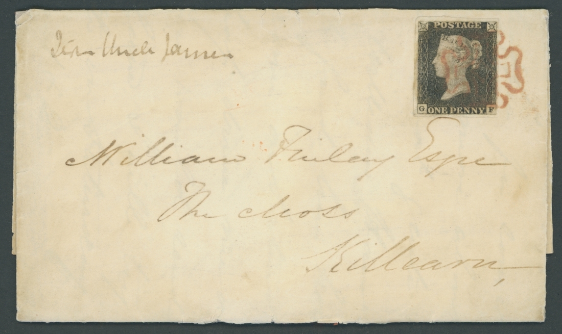 GF, grey black shade. displaying a worn impression, good to large margins all round, tied by an upright  red Maltese Cross cancellation to entire letter to Killearn with fine red Glasgow c.d.s. of 21 May 1840 on the reverse; the entire with some strengthened splits along the edges and the adhesive with wrinkle at top left; a fine May date cover