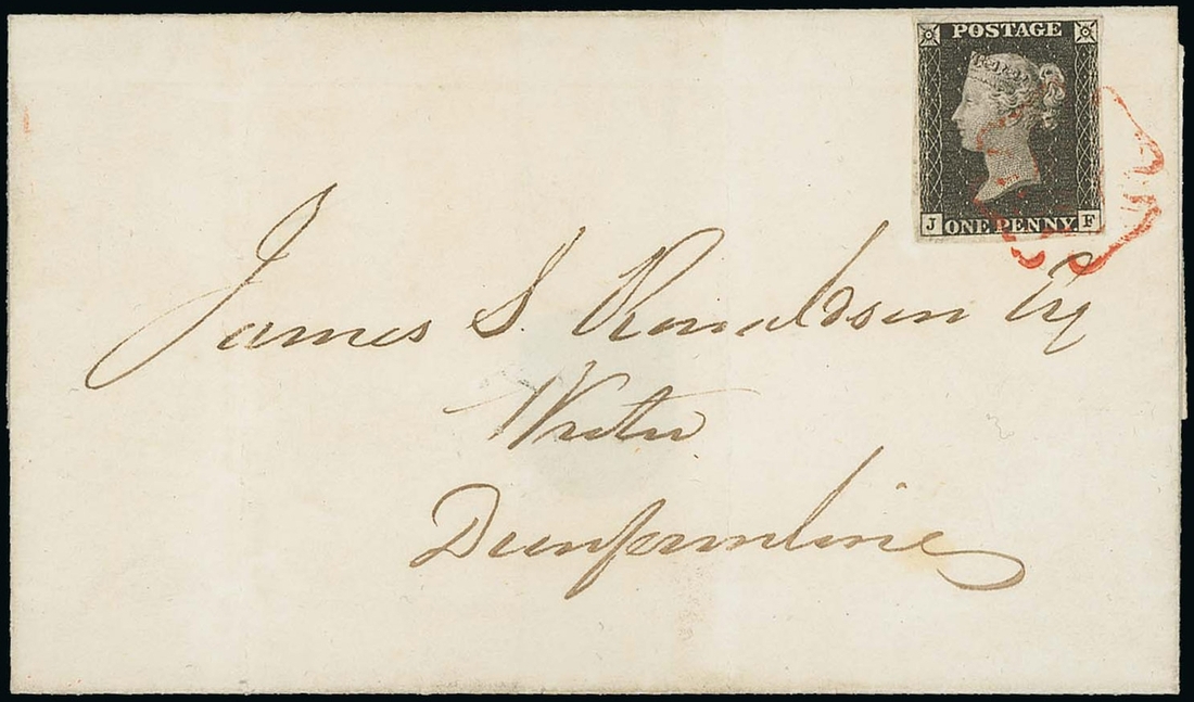 JF, good to large margins, tied by red Maltese Cross in light shade to 1840 (18 May) entire from Edinburgh to Dunfermline with Edinburgh c.d.s. of 18 May 1840 on the reverse;  clean and a fine May date. R.P.S. Certificate (2005)