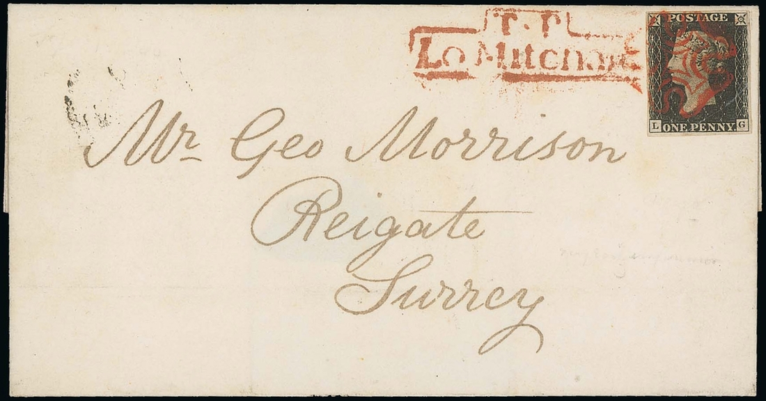 LG, intense black, tied by well struck red Maltese Cross to 1840 (21 Sept.) entire from London to Reigate, the face struck with "