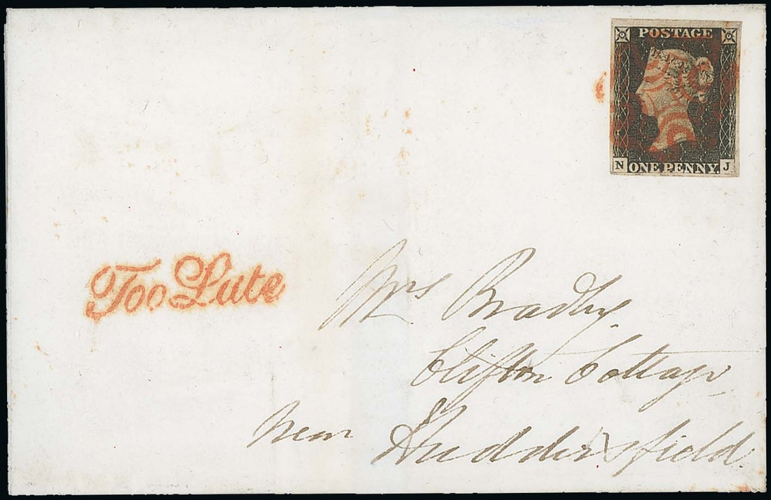 NJ, large margins, tied by a fine red Maltese Cross cancellation to entire to Huddersfield  with red script Too Late alongside, dated markings of 20 July 1840 on the reverse; clean and uncreased. Most appealing
