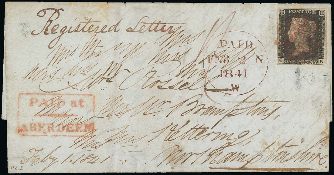 QB, close to large margins all round, tied by Ruby Maltese Cross of Aberdeen to 1841 (1 Feb.) entire letter from Aberdeen to Kettering, endorsed "Registered Letter", charged "1/-" and struck with boxed "