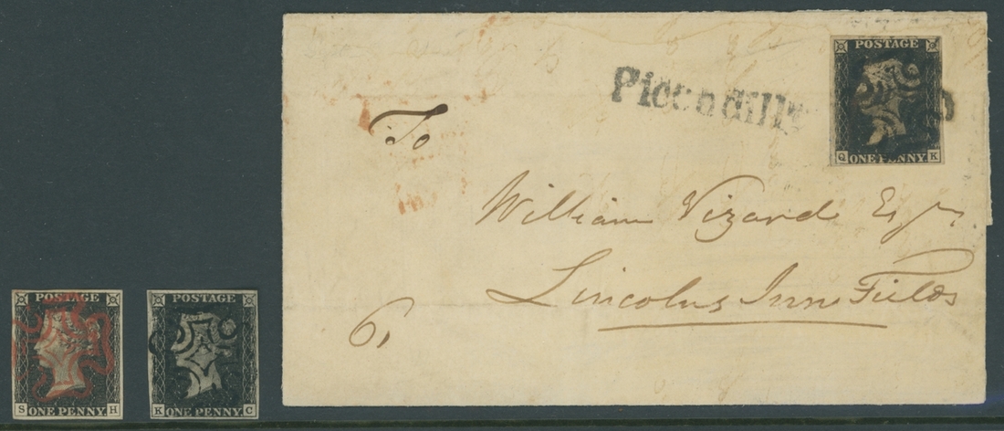 SH, good to large margins, complete, central and upright red Maltese Cross cancellation, very fine.  Plate 9: KC, good margins, black Maltese Cross, fine. Also unplated QK, good to large margins, tied by black Maltese Cross to entire to Lincolnshire with London datestamp of 25 Sept. 1840 (the period of experimental use of the black Cross), crossed by pressed filing fold
