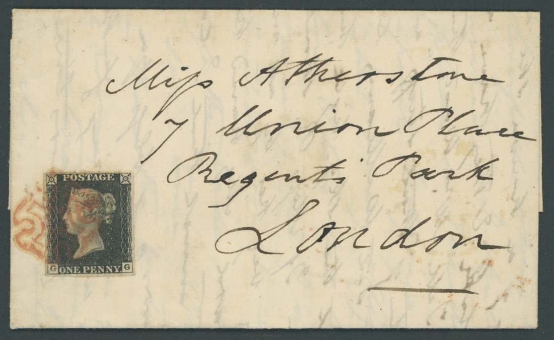 GG, clear margins all round, affixed to lower left corner, contrary to regulations, and tied by red Maltese Cross to 1840 (12 Aug.) entire letter from Birmingham to "Miss Atherstone" in Regents Park, London; the letter written by Edwin Atherstone, poet, provides an account of his trip to visit his daughter, Mary Elizabeth who would publish a book on her father's works.  The reverse with superb "MY HOPE" pink wafer seal, Birmingham and London d.s.  Fine.
