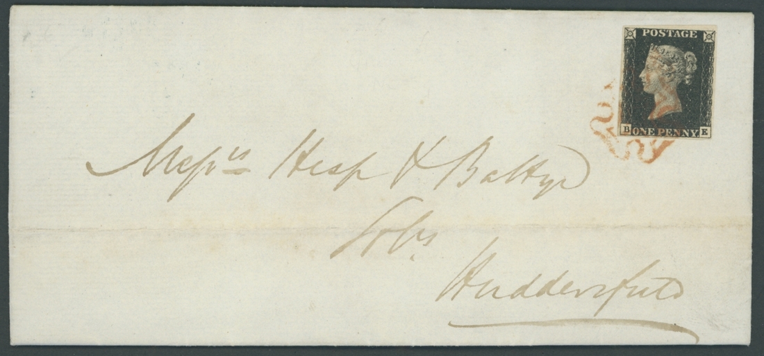 BE, intense black shade, small to large margins all round, tied by red Maltese Cross cancellation  to entire letter to Huddersfield and with Halifax c.d.s. of 6 Oct. 1840 on the reverse; fine