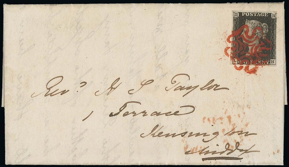 LH, good to large margins, just shaving the outer frameline at top, tied by red Maltese Cross in very striking shade to entire letter from Billericay to Kensington, the reverse with Billericay and London d.s.  A scarce late usage of the red ink which was known in use at Billericay until Christmas of 1841.