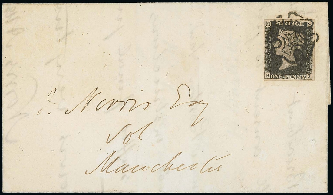 BJ, greyish black shade, clear to good margins, tied by a wonderful crisp black Maltese Cross  cancellation to entire letter to Manchester, dated marking of 12 Feb. 1841 on the reverse (third day of official usage of the black Cross); fine
