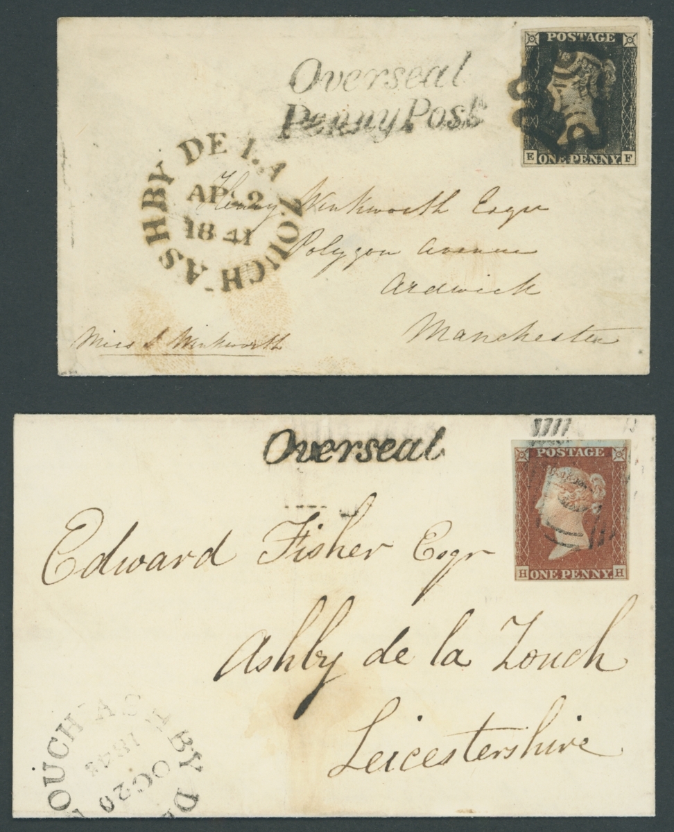 EF, greyish black shade, good to large margins all round,  tied by a fine black Maltese Cross cancellation to small mourning envelope to Manchester with Overseal/Penny Post handstamp and Ashby de la Zouch c.d.s. of 2 April 1841 alongside. Also entire letter to Ashby de la Zouch franked 1841-53 1d. Plate 68; HH, with "30" barred oval cancellation and  Overseal (Penny Post removed) and c.d.s. of 20 Oct. 1845 alongside. A fine pair. Each with Eichele Certificate (2011)