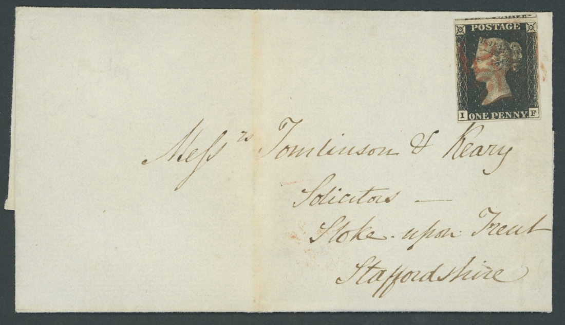 IF, clear to huge margins all round and showing a good portion of the adjoining stamp at top,  tied by a red Maltese Cross cancellation to entire to Stoke upon Trent, on reverse Rugely c.d.s. and another strike of the Maltese Cross; vertical filing fold, fine