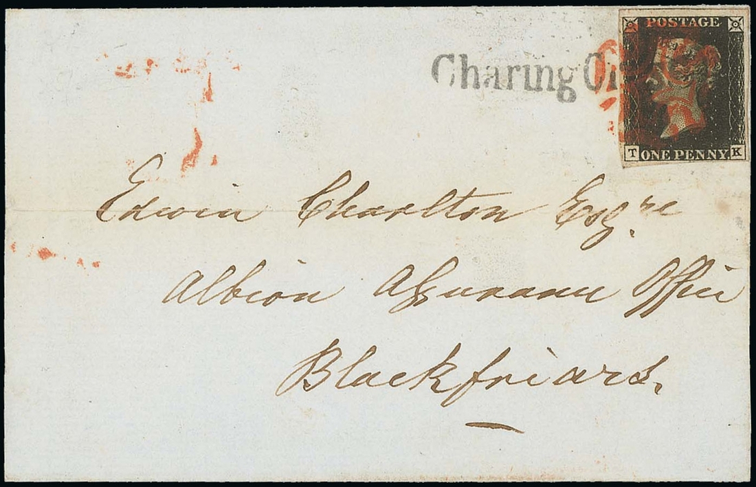 TK, close to very large margins, tied by red Maltese Cross and straight line "Charing Cross St." handstamp to reduced entire to Blackfriars.   Fine and appealing.