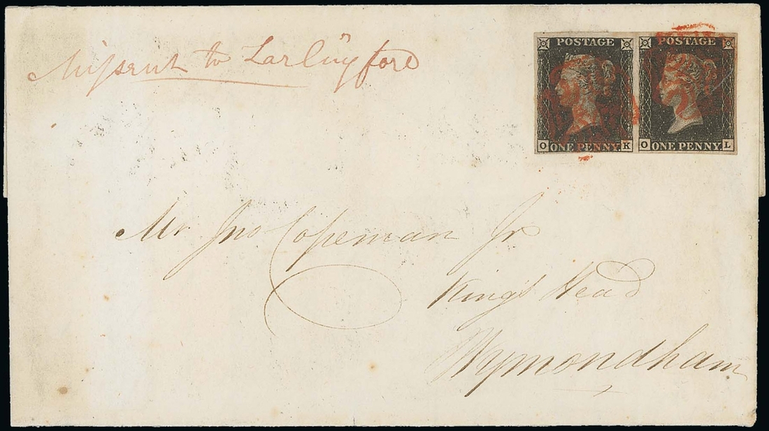 OK-OL horizontal pair, clear to large margins tied to entire from Norwich to Wymondham by red Maltese cross cancellations, manuscript 'Missent to Larlingford' manuscript at upper left and with 'Too Late' handstamp on reverse; fine and rare.  B.P.A. Certificate (1998)