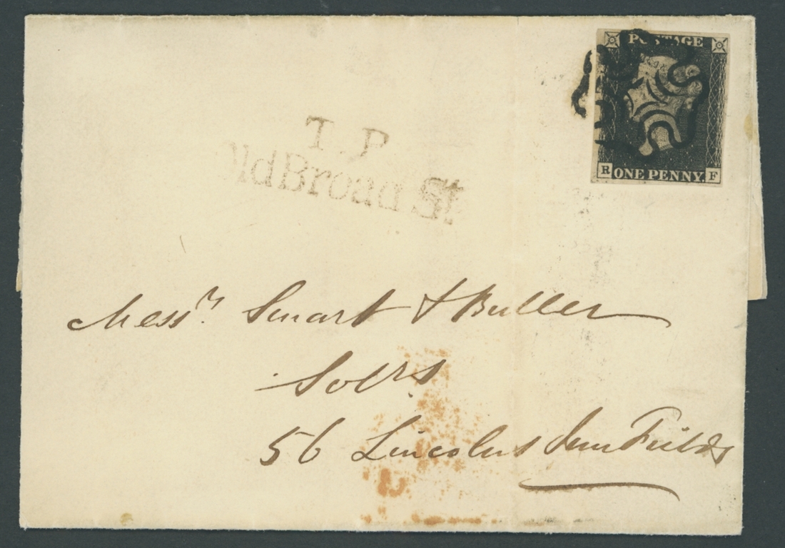 RF, close to good margins, tied by London "Broken Points" Maltese Cross cancellation  to entire to Lincoln Inns Fields,  dated 11 Feb. 1841 with "T.P./Old Broad St." alongside, datestamp on reverse; the entire folded slightly out of shape to improve appearance