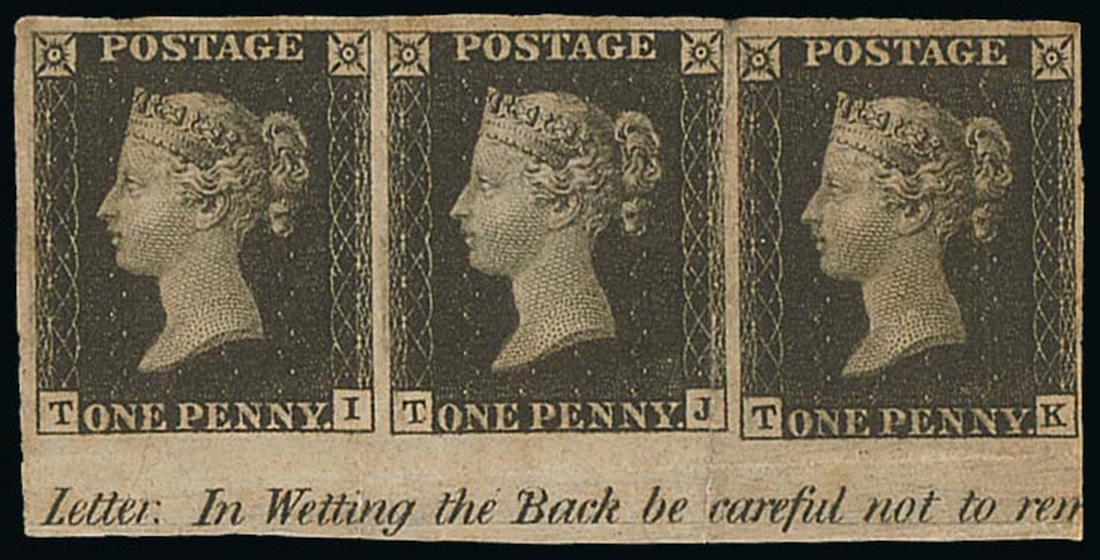 TI-TK strip of three in a good shade of black, with large part lower margin showing imprint,  other margins small to very large, with full original gum; four vertical creases, two are quite heavy causing some splitting of the paper, a horizontal crease in the lower margin. A spectacular strip of great visual appeal. R.P.S. Certificate (2011). Photo