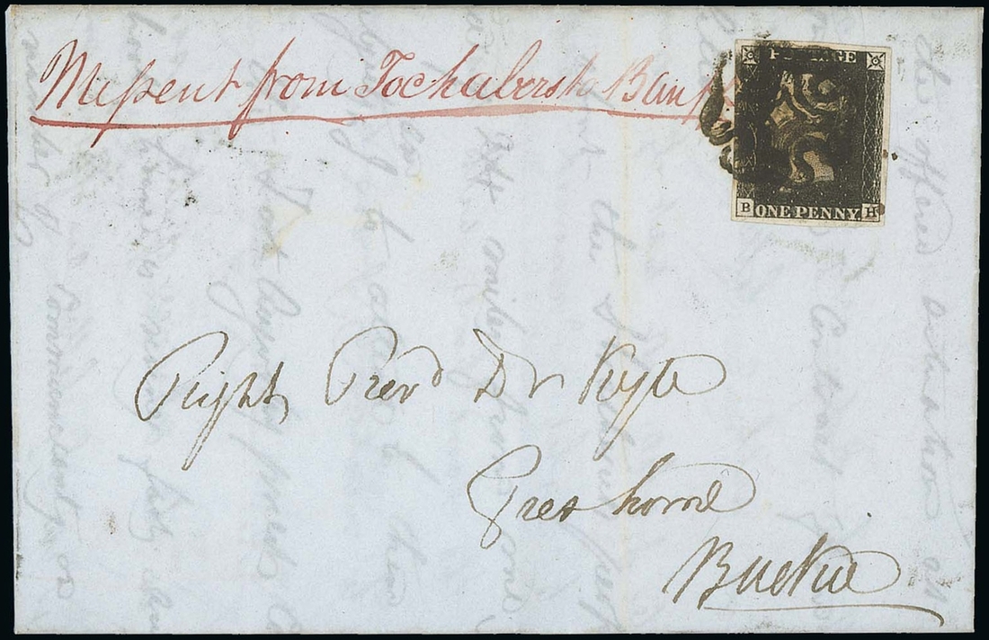 BH, clear margins all round, tied by black Maltese Cross to 1841 (12 April) entire letter from Inverness to Buckie with endorsement at top of address panel reading "Missent from Fochabers to Banff", the adhesive seemingly affixed and tied over this endorsement. The reverse with Inverness, Banff and Buckie boxed d.s.  Filing folds clear of the adhesive, fine and unusual.