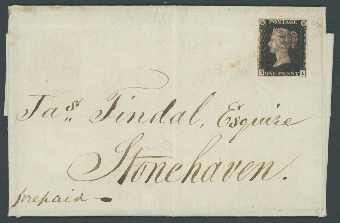 FF, clear margins all round, cancelled by red Maltese Cross and affixed to 1841 (22 Jan.) turned letter initially addressed to Aberdeen, turned and addressed to Stonehaven and franked with SI, clear margins all round, just tied by red Maltese Cross, this panel endorsed "prepaid", the reverse with Aberdeen boxed d.s.  Some folds, as to be expected, one just crossing SI, otherwise fine