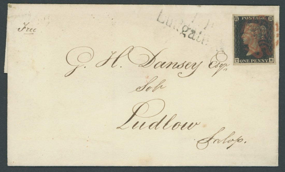 TE, good to very large margins all round, tied by a fine red Maltese Cross cancellation to entire to Ludlow,  endorsed Free at upper left and with T.P./Ludgate St. alongside, on reverse fine intact black wax Reindeer and Lion seal; fine