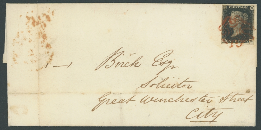 QK, intense black shade, good to large margins all round,  tied by fine red Maltese Cross cancellation to entire to London with Waltham c.d.s. of 31 Jan. 1841 on the reverse; filing folds well clear of the adhesive,  fine.