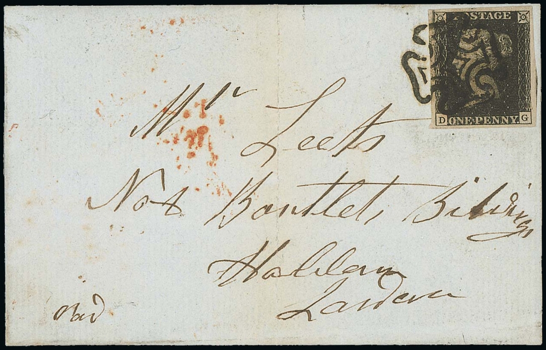 DG, large to huge margins and showing a portion of the adjoining stamp at right, tied by a fine black Maltese Cross cancellation to entire letter to London, Mitcham c.d.s. of  24 Feb. 1841 on the reverse; clean vertical filing fold well clear of the adhesive, fine and an exceptional Plate 10 cover. Rare in this condition