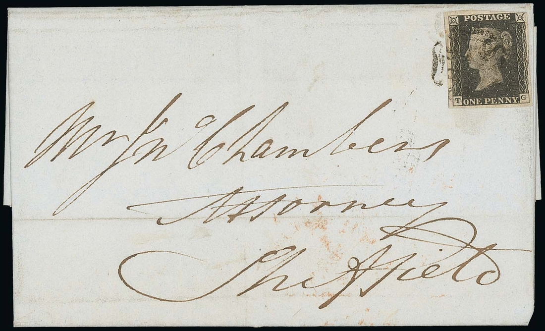 TG, good to large margins affixed and tied to 1841 (18 Mar.) entire (with contents)  from Wolverhampton to Sheffield by black Maltese cross,