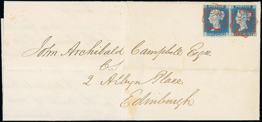 CB and CH, good to large margins all round, tied by fine orange-red Maltese Cross cancellations to long letter to Edinburgh, Perth c.d.s. of 13 July 1840 on the reverse; small faults but a most attractive entire