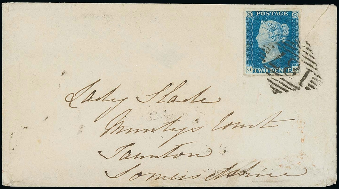 OD, large but slightly uneven margins, tied by black Irish "187" of Dundalk which leaves the Queen's profile practicality clear, to envelope addressed to Taunton, dated markings of May 1846 on reverse; late use from Ireland and most attractive. B.P.A. Certificate (2001) stating ".... adhesive lifted and replaced, is genuine."