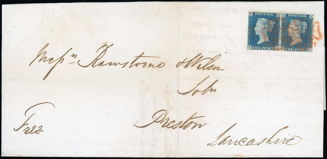 TK-TL, horizontal pair, TL just touched, otherwise close to good margins, tied by two good red Maltese Cross cancellations, leaving TK with the Queen's profile clear, to long entire letter to Preston with London datestamp of 10 June 1840 on the reverse; clean filing folds clear of the adhesives; attractive and scarce