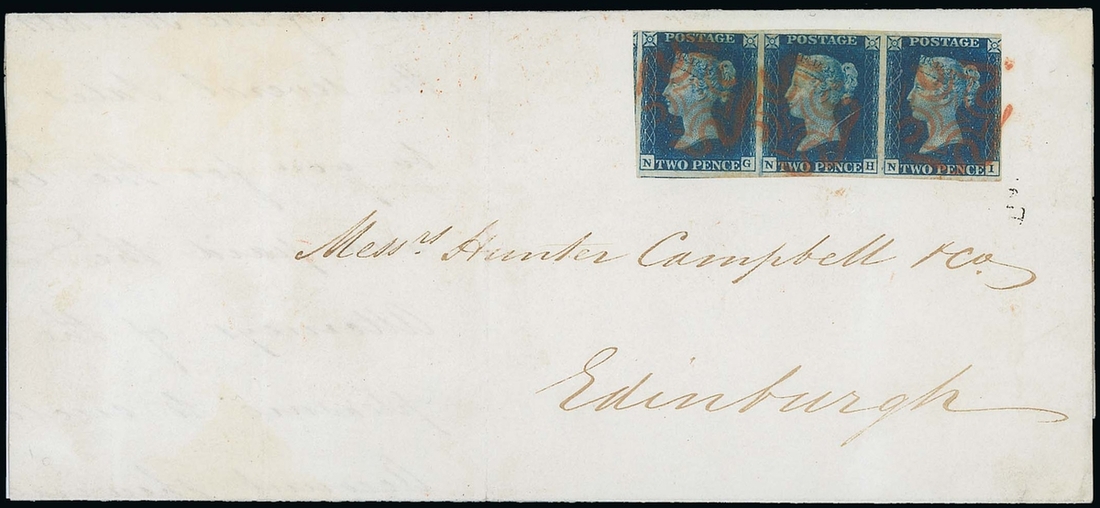 NG-NI horizontal strip of three in deep shade, very large to close margins showing portions of the adjoining stamps at left and foot of the left stamp, just touched at far right, tied by red Maltese Crosses to 1840 (4 Dec.) entire letter (truncated) from London to Edinburgh. Of very fine appearing and a rare combination, very fine and rare.