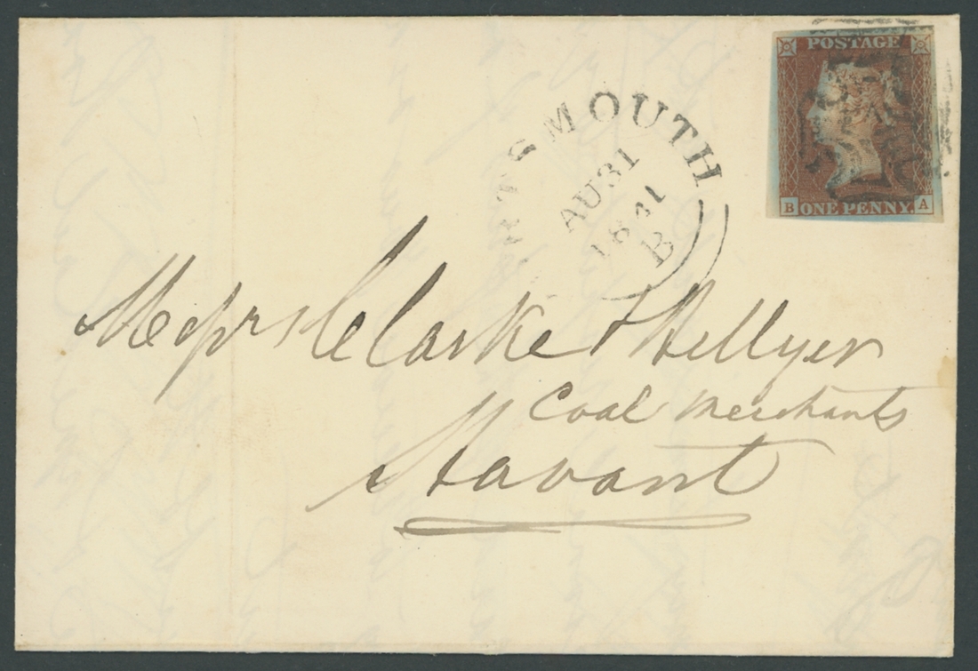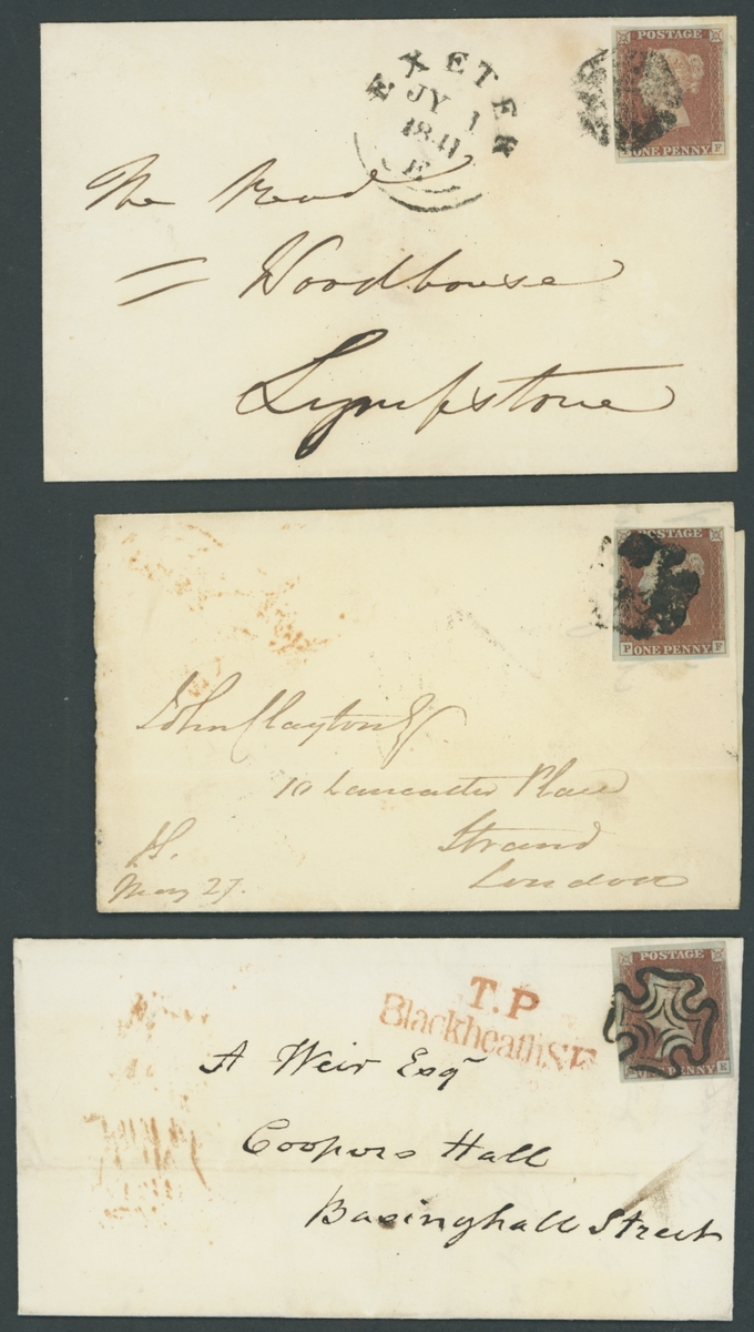 Plate 1B: TF, on envelope from Exeter to Lympstone, Plate 5: PF, tied to entire (no side flaps) from Belper to London, Plate 9: ME on entire with red T.P/BlackheathSE alongside, Plate 11: BA, on entire letter from Portsmouth to Havant. Black Maltese Cross cancellations and four margins. A fine group (4 items)