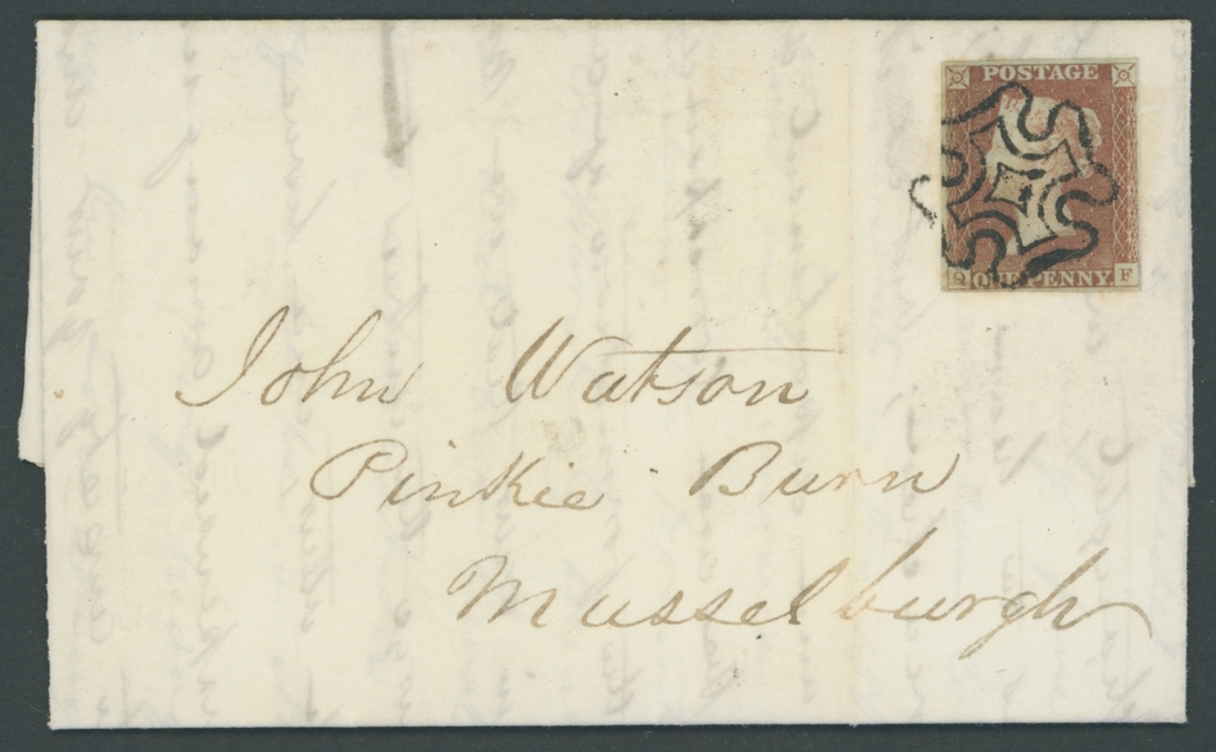Plate 8: QF, small to good margins, tied by a superb strike of the Kettle distinctive Maltese Cross to entire letter to Musselburgh, dated markings of Oct. 6 and 7 on the reverse; fine