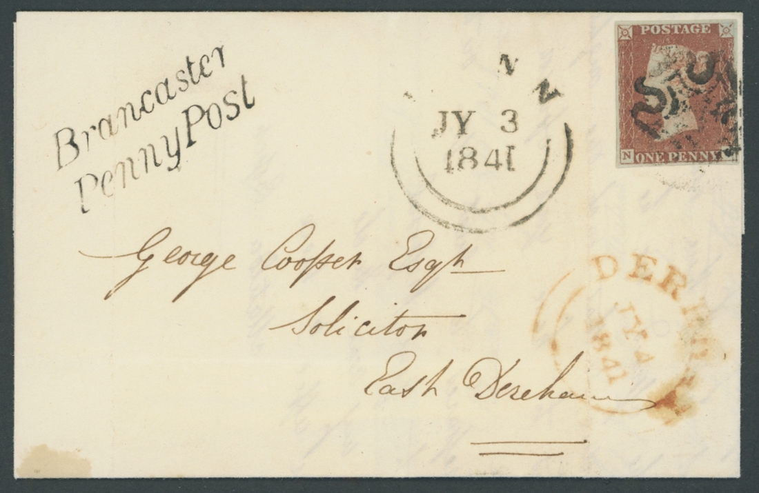 Plate 9: NC, good margins all round, tied by black Maltese Cross to entire to East Dereham  dated 3 July 1841, Brancaster/Penny Post and dated markings of Lynn and Dereham on the front; filing fold clear of the adhesive; fine
