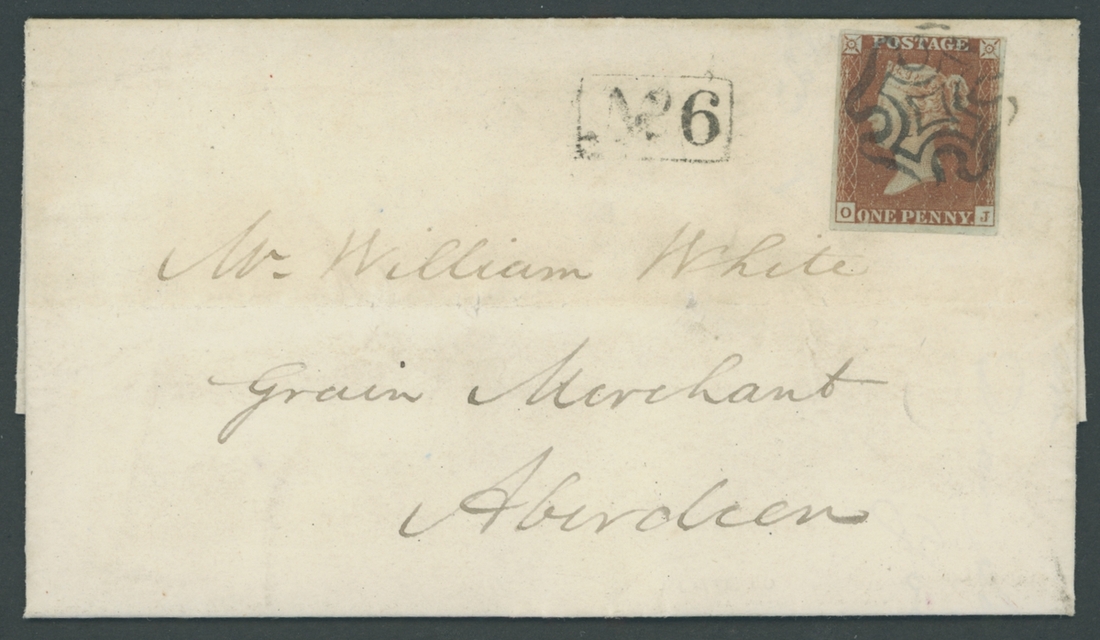 Plate 10: OJ (constant variety), clear to good margins, tied by black  Maltese Cross to entire letter to Aberdeen dated 16 Oct. 1841 with framed "No. 6" alongside, dated marking on reverse; fine appearance but a little soiled on the interior