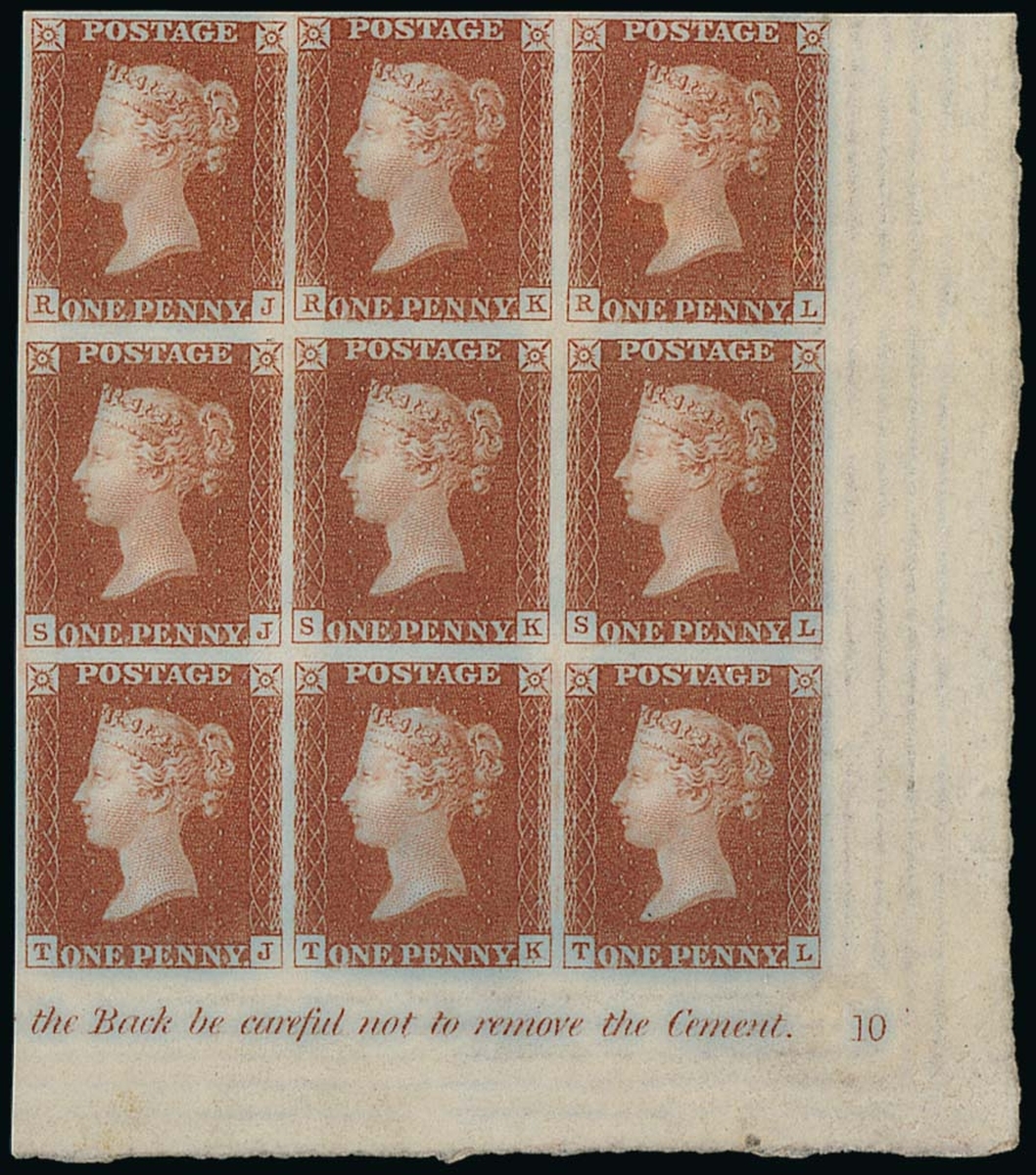 RJ-TL corner marginal block of nine (3x3), superb mint with full original gum, clear margins all round showing partial inscription at foot "... the Back be careful not to remove the Cement." and plate number "10"; RJ and RJ showing basal shift, SJ and TJ with J flaw, RJ showing "P" converted to "R" by hand engraving.  A marvellous and important block from this  of exhibition quality.