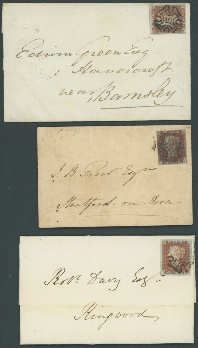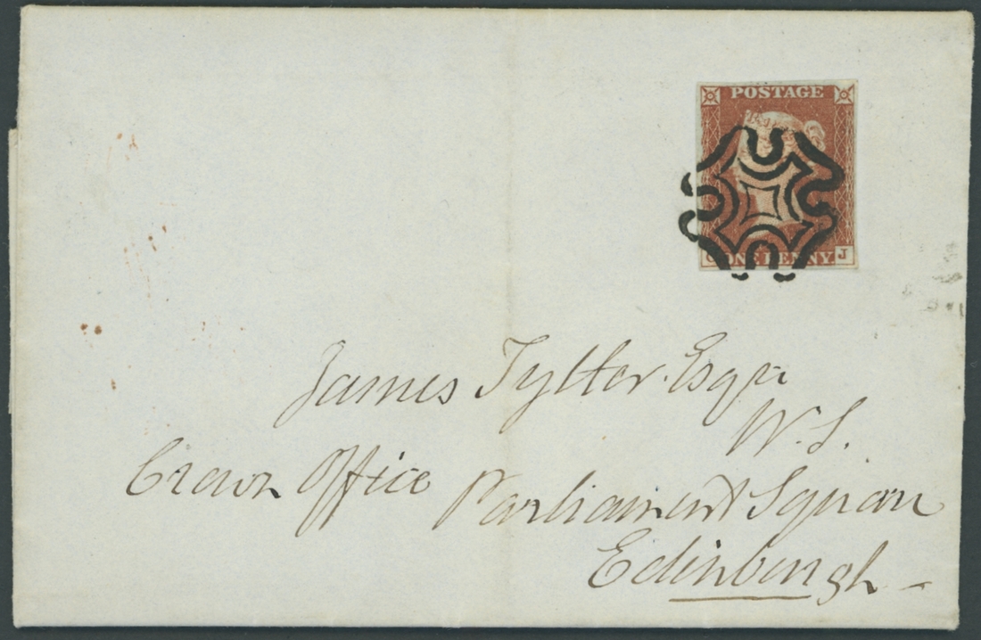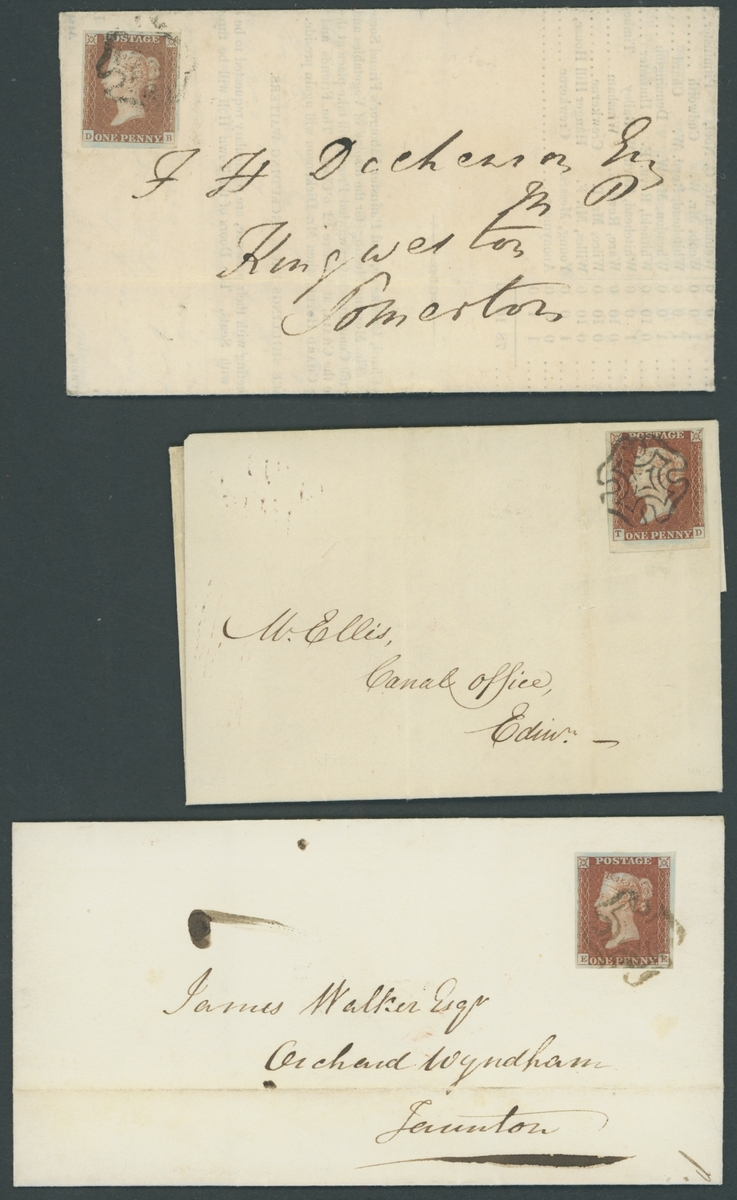 Plate 13: JE, placed sideways, on entire from Rochdate to Barnsley,  Plate 16: NI, on envelope from Cheltenham to Stratford, Plate 23: MH, on entire letter from Whitehall to Ringwood, Plate 27: DB, on printed entire from Ilminster to Somerton, Plate 30: TD, on Edinburgh local entire, Plate 32: EE, on entire from Ilminster to Taunton, OJ on entire letter from Montrose to Edinburgh; all four margin examples with black Maltese Cross cancellations. A fine group (7 items)