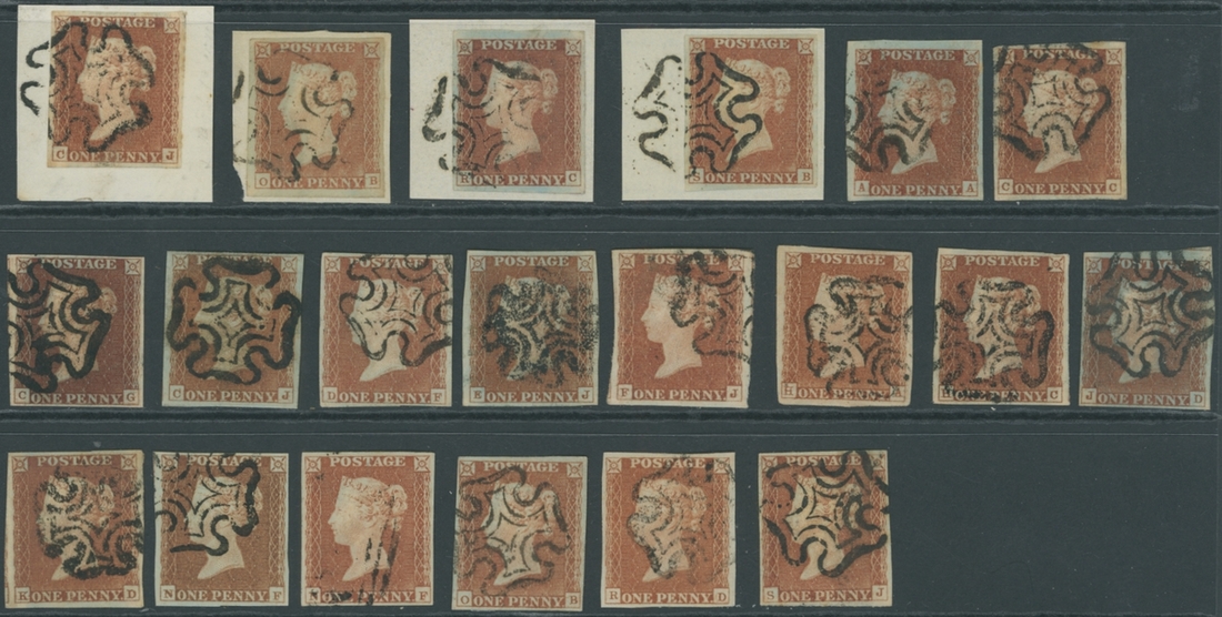 Plate 19: Selection of twenty,  all but one with black Maltese Cross cancellations, four on pieces, margins all round; chiefly fine