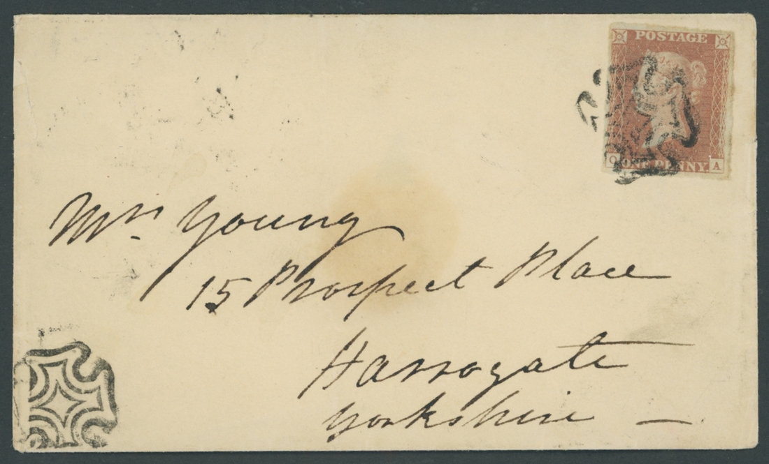 Plate 24: OA, slightly touched at left, tied by black Maltese Cross to envelope to Harrogate  and with another strike at lower left, dated markings of Aug. 7 and 8 1842 on the reverse; vertical filing fold, fine and unusual
