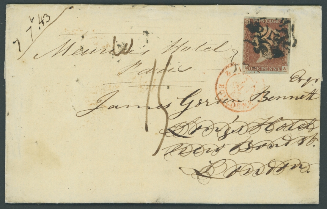1843 (5 Sept.) entire letter to London, re-directed to Paris, franked 1d. BA with close to very large margins all round, tied by a Brighton distinctive Maltese Cross and  red transit datestamp; fine