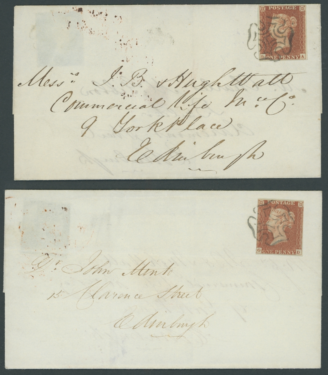 GF, on Edinburgh local entire, "turned" and returned with GD three days later,  also DB on another Edinburgh local letter, "turned" and returned one day later with DA, Maltese Cross cancellations; touched or creased at places, a fine and attractive pair