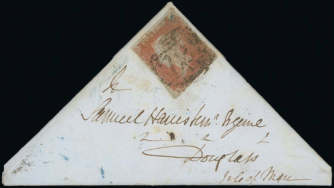 K?, touched and faults, tied by "723" barred oval of Southampton to entire letter folded into a triangle, addressed to the Isle of Man,  Southampton, Liverpool and Douglas datestamps on the reverse, unusual