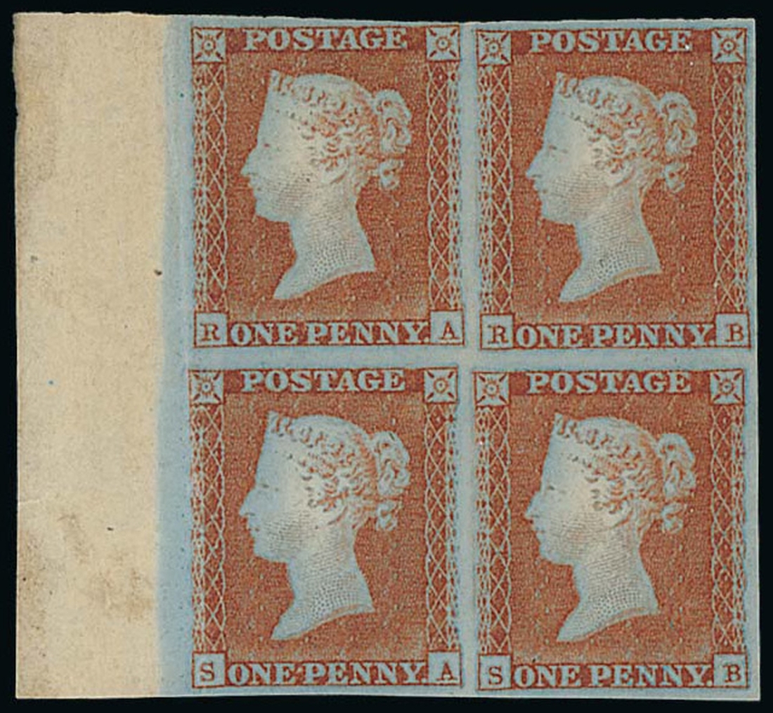 RA-SB marginal block of four from the left of the sheet on heavily blued paper, good to large margins all round, large part original gum, the pper right stamp unmounted, crease in margin at right, just shaving SA;  a most attractive multiple.