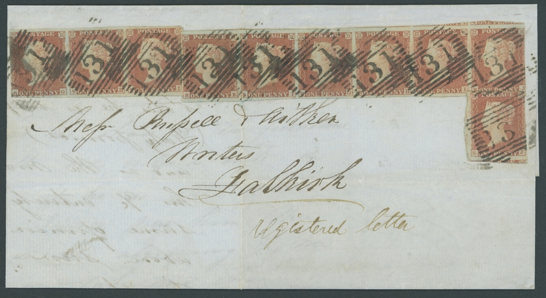 SG-SI and RE-RJ horizontal strips of three and six alongside SJ single, all with good to large margins, affixed overlapping and tied by '131' barred numerals of Edinburgh to 1851 (11 Feb.) entire letter registered to Falkirk, endorsed on face "registered letter"; the reverse with Edinburgh receiving d.s. in red and Falkirk double arc d.s. in blue.  Filing folds affect only RF and SJ, otherwise fine and a dramatic franking.