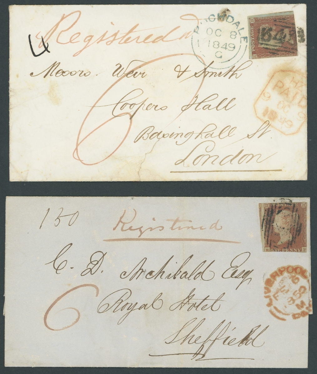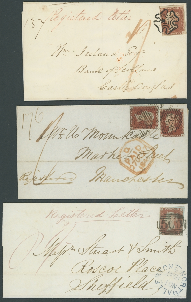 1852-50, five entires franked imperf. 1d.,  each endorsed Registered or Registered Letter, including 1842 from Glasgow to Castle Douglas with superb Maltese Cross, 1845 double rate cover from London to Manchester, 1849 and 1850 charged additional 6d., the others charged 1/-; good to fine