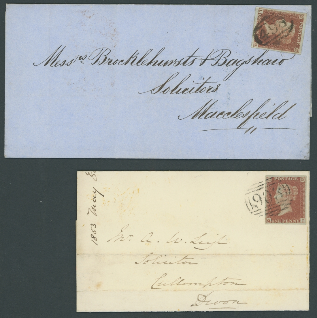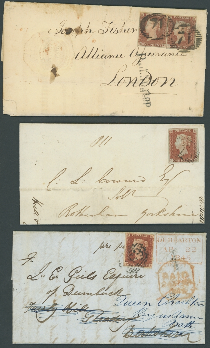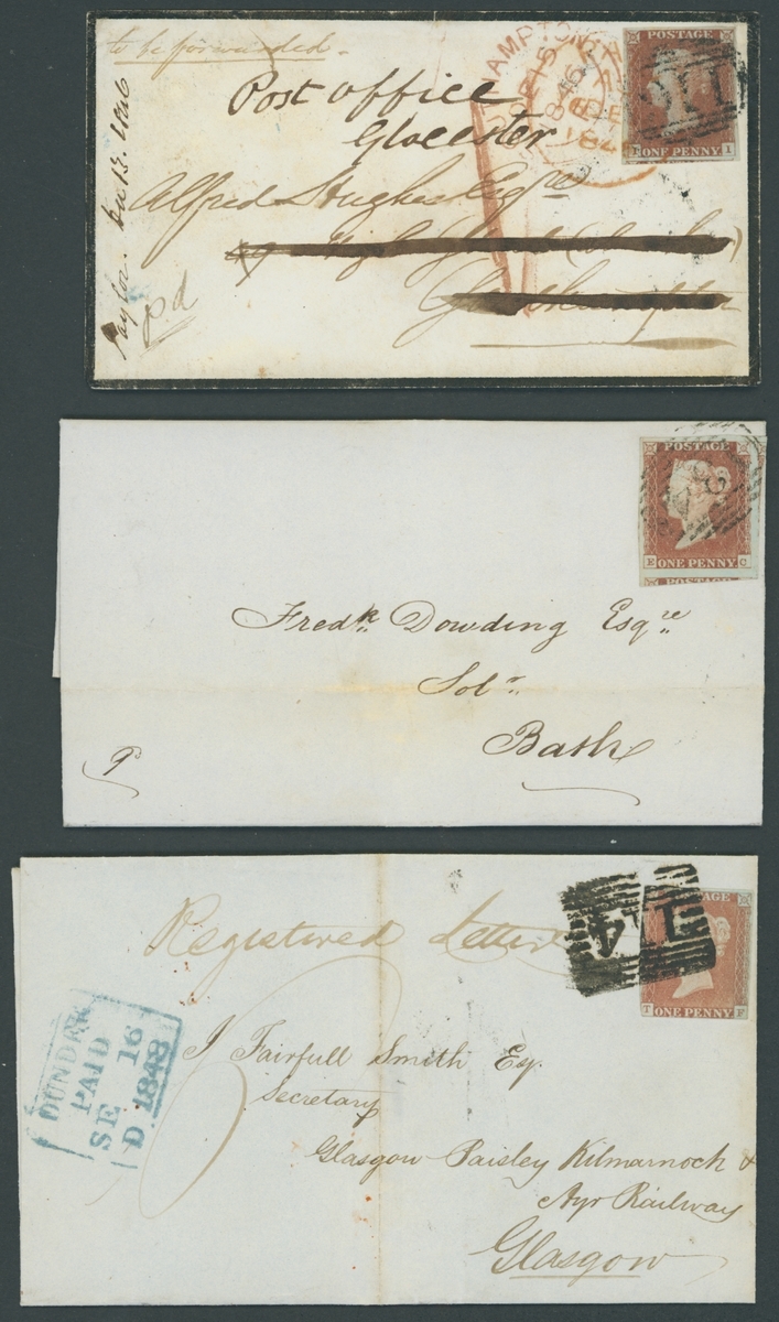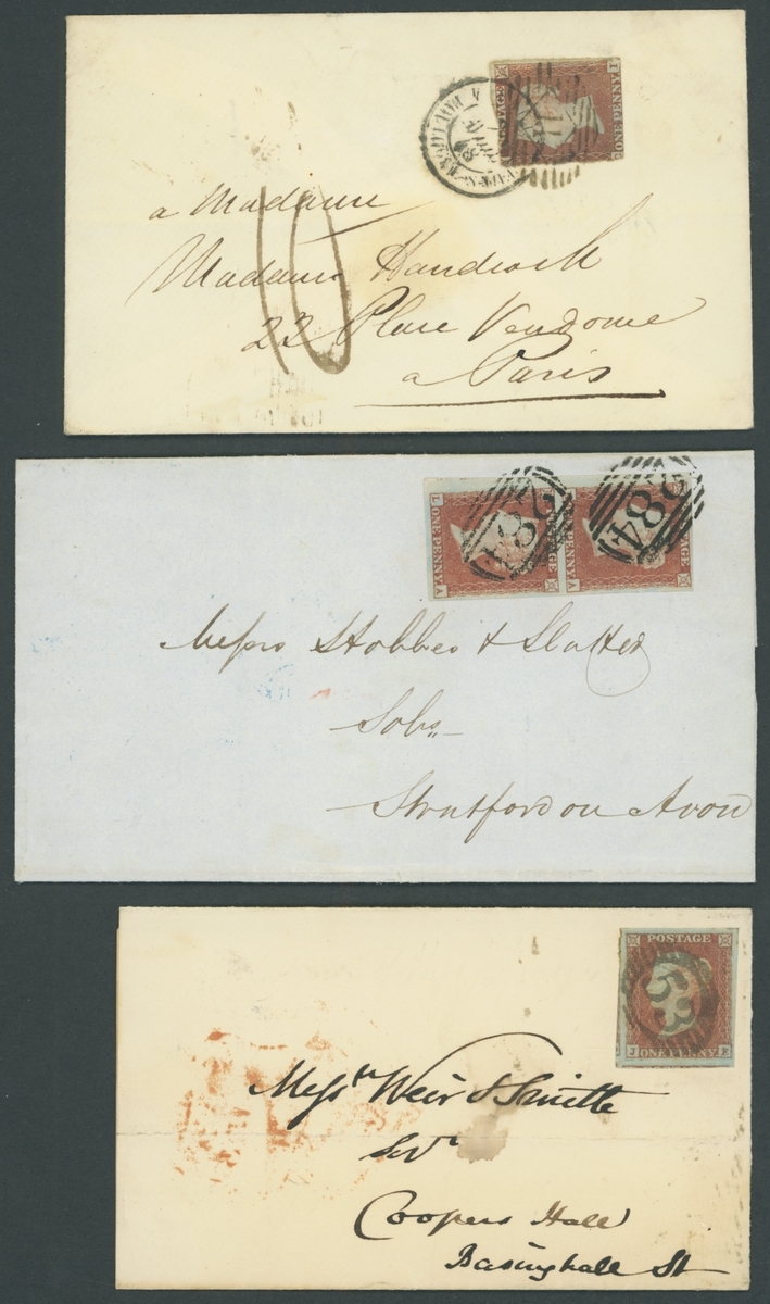 1844-53, eleven entires, including 1844 indenture with embossed £3 stamp, franked 1d. (2),  1846 mourning envelope franked 1d. with "116" barred oval, redirected and with additional red  London Paid datestamp, 1848 entire letter from Dundee to Glasgow, franked 1d., endorsed Registered Letter and with manuscript "6", 1848 envelope to Paris franked 1d. (faults), 1850 entire franked 1d. KA-LA vertical pair, etc., chiefly fine