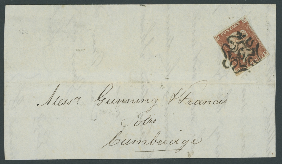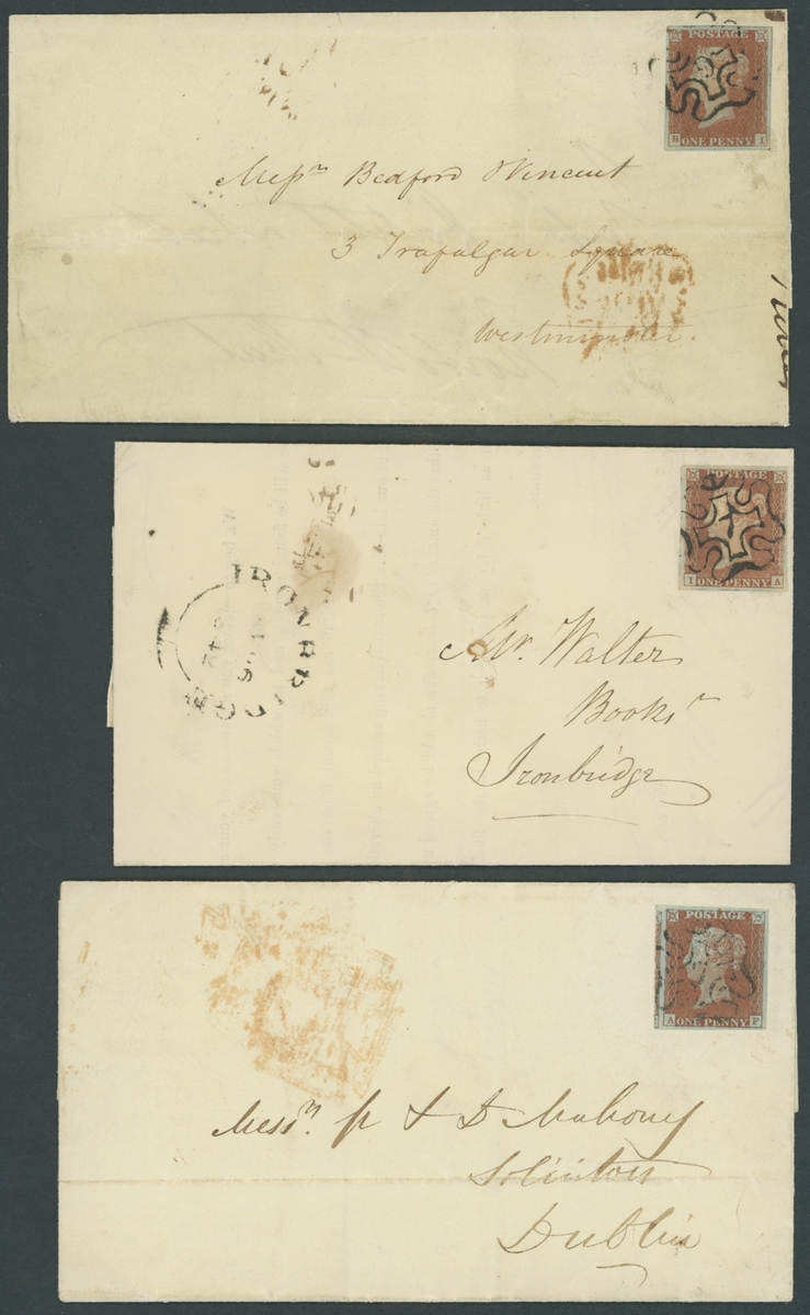1844 (11 May), entire letter (no side flaps) franked 1d. DE with large margins,  tied by "6" in Maltese Cross, also 1844 (2 Feb.) entire to Dublin franked 1d. AF, good to huge margins with fine and upright "7" in Cross, 1853 (24 April) printed entire letter to Ironbridge franked 1d. IA with fine "7" in Cross, 1843 (15 Nov.), entire to Westminster franked 1d. with "9" in Cross; good to fine
