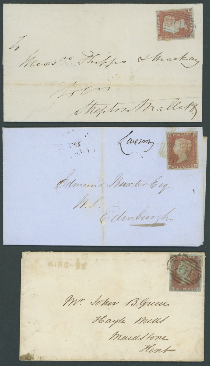 1850 (11 Dec.), entire to Shepton Mallett with blue "306" barred oval of Frome,  1851 (20 March) entire letter to Edinburgh with blue/green Scottish "38" of Bathgate, 1852 (16 Nov.) envelope to Maidstone with brown "493" numeral of Maidstone; each franked 1d. with good to large margins