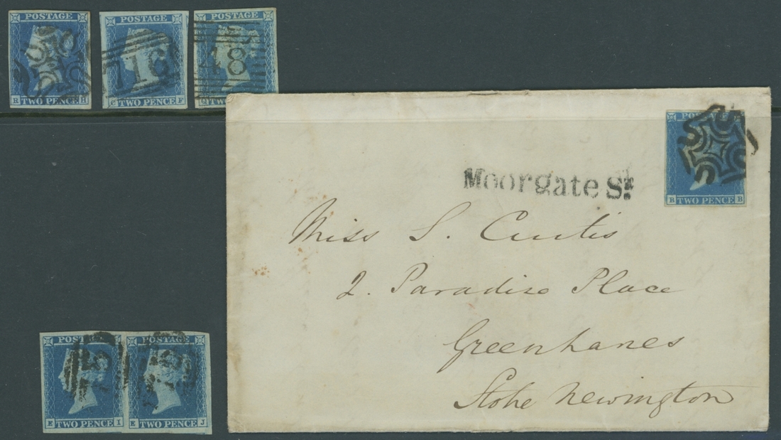 BB, good margins, tied by a fine black Maltese Cross to entire letter to Stoke Newington  with Moorgate St. receiver alongside, RH, close to good margins with fine No. "12" in Maltese Cross cancellation, Plate 4: CF, close to large margins and showing portions of adjoining stamps at left and right, "716" barred oval cancellation of Sleaford, EI-EJ horizontal pair with good to very large margins all round and showing portions of two adjoining stamp at foot, "75" barred oval cancellations of Birmingham, QA, large margins, Scottish "...48" numeral; good to fine