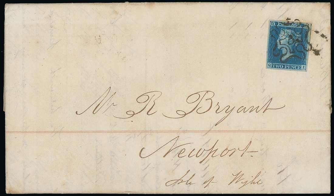 QI, large margins and showing a portion of the adjoining stamp at right,  tied to printed manifest for goods on board the ship Vectis, by a fine "5" in Maltese Cross, addressed to Newport and with dated markings of 16 and 17 June 1843 on the reverse. Exceptional