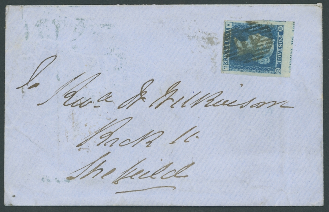 AL, from the top of the sheet and part of the inscription "...(Rem)ove the cem...",  large to very large margins other sides and showing a portion of the adjoining stamp at left, tied by London inland barred oval cancellation to blue envelope to Sheffield, dated markings on reverse; a little wrinkled but rare