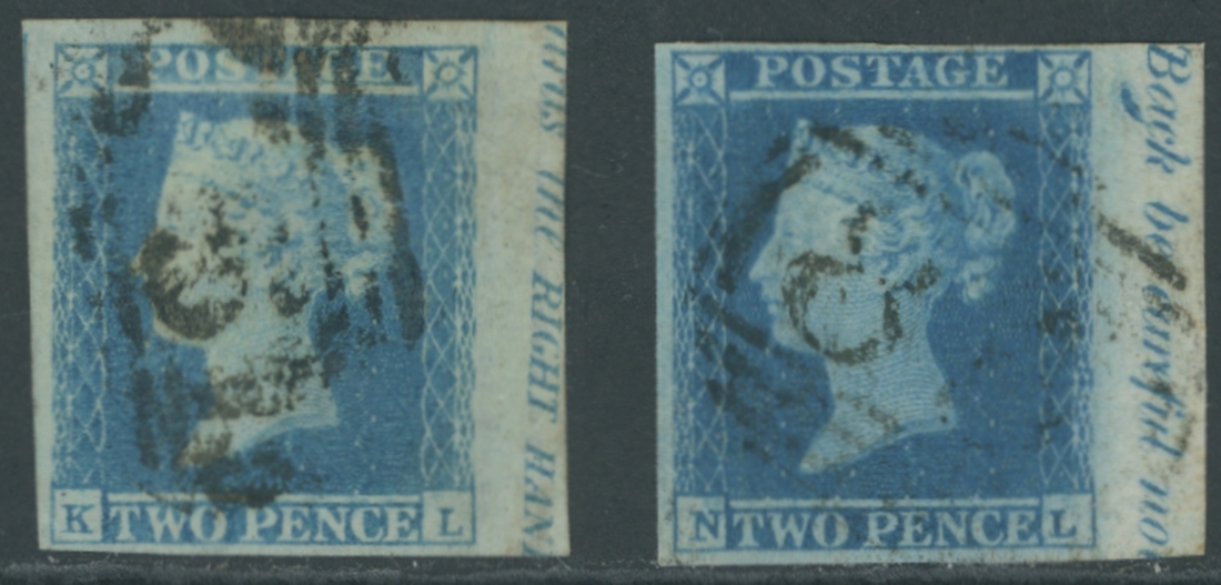 KL and NL, both from the right of the sheet and showing marginal inscription  and with good to large margins other sides, barred oval cancellations; fine